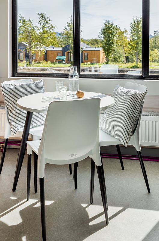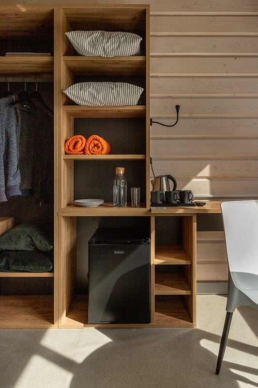 Accommodation is double in Standard modular lodges, 21 metres square. Each has a shower, a toilet room and a dining area. The base has an outdoor swimming pool with hot water, a good restaurant, a children's zone, a spa area.