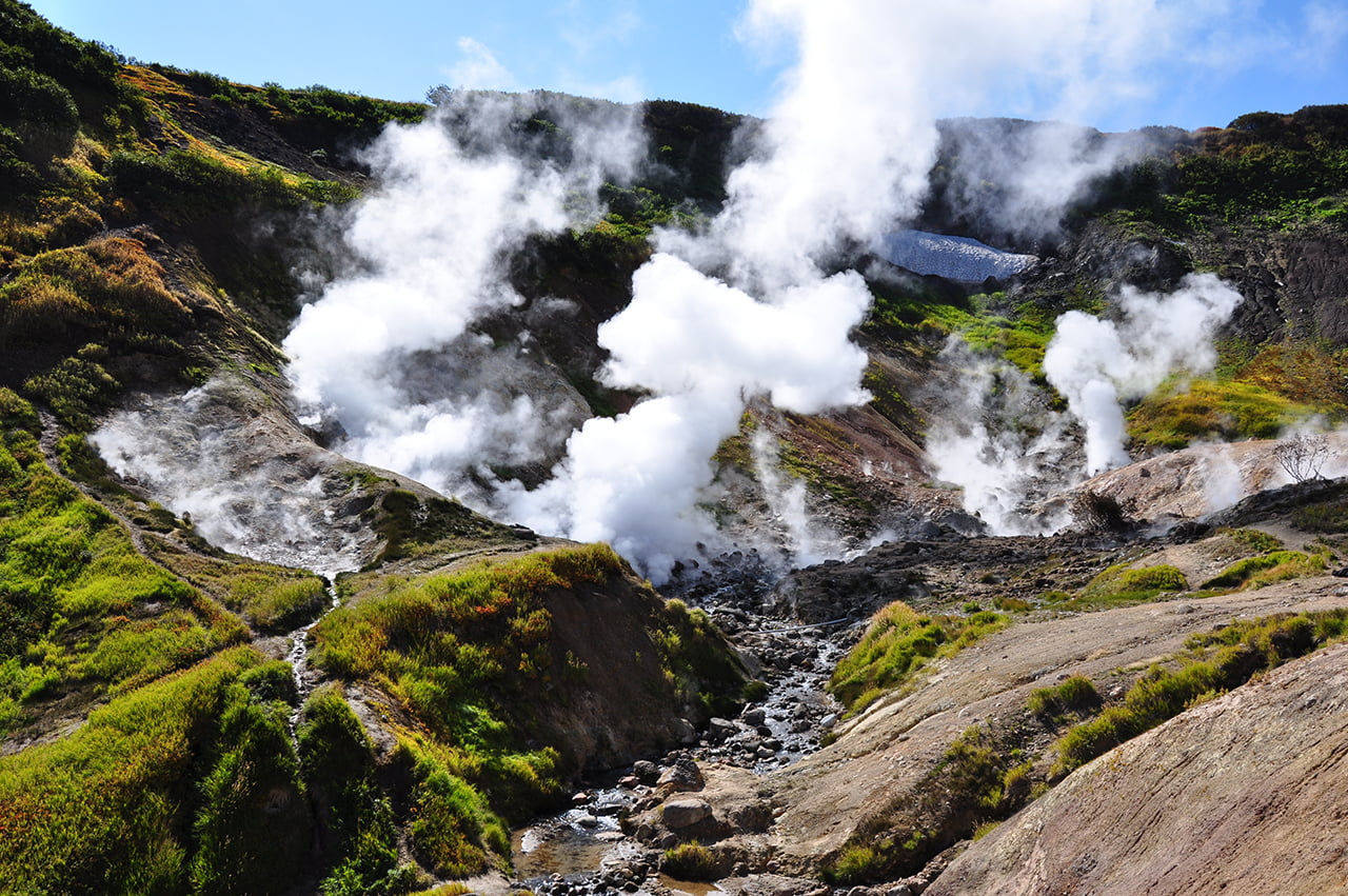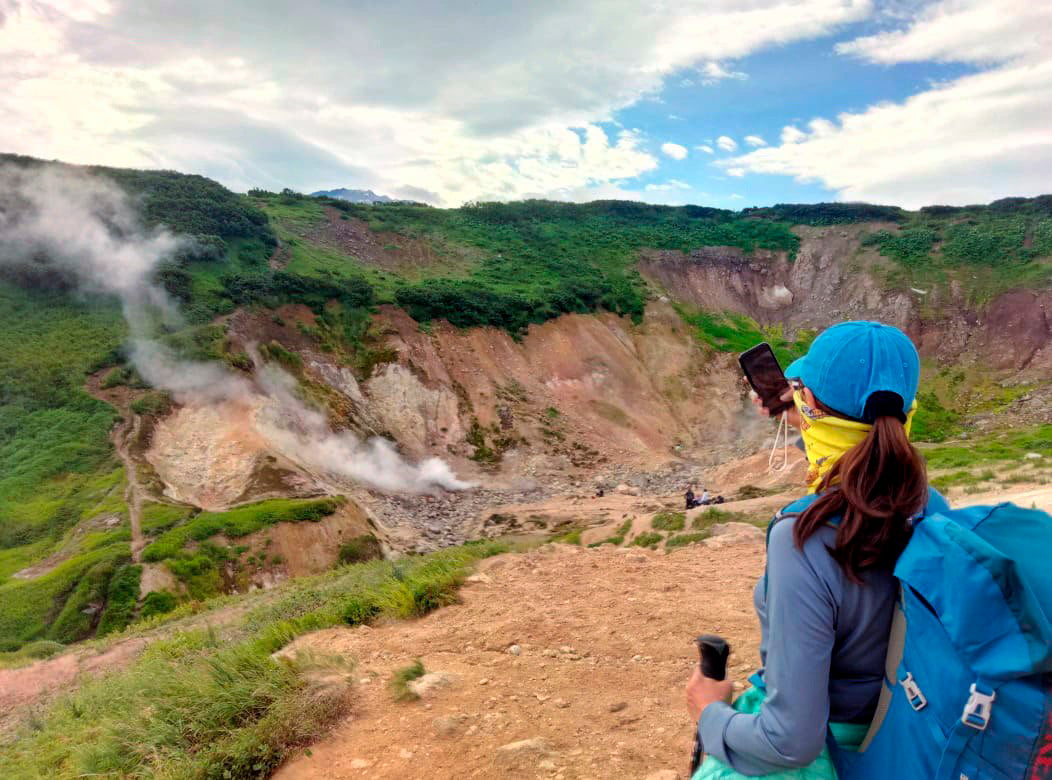Closer to the destination, the landscape changes: there are fewer trees, more stones and mosses, and completely different shades of earth. At some point, everyone notices a faint smell of sulfur in the air and thin streams of steam ahead. The vehicle stops, and from there the group continues on foot.