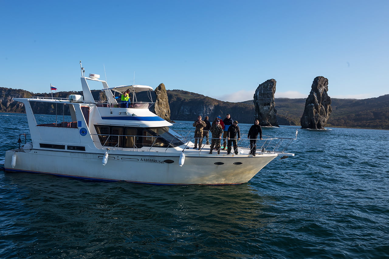 The route runs through Avacha Bay towards the Three Brothers rocks. During this time, you can listen to stories from our captain‑guide about the bay, its history, local fishing, and navigation in general.